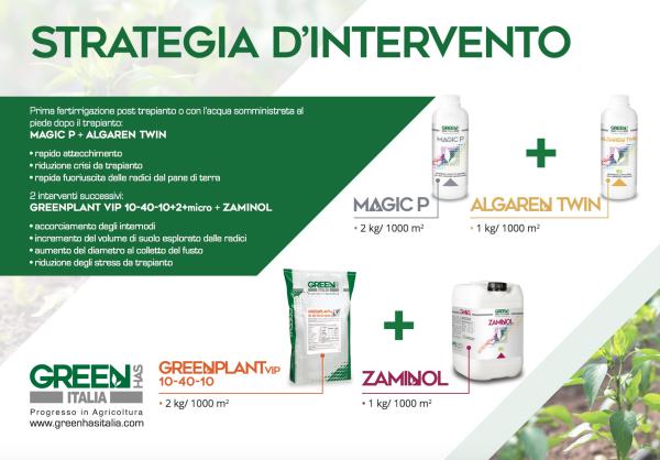 Nella fase di post-trapianto le orticole devono essere stimolate a radicare: le energie della pianta vanno concentrate su questo obiettivo, un presupposto fondamentale per la futura crescita. Con un apparato radicale più sviluppato, infatti, la pianta è meno soggetta a stress termici ed idrici, riesce ad assorbire più acqua ed elementi nutritivi, in buona sostanza ha un maggior equilibrio vegeto-produttivo, con nodi più corti e minor traspirazione. Dopo la radicazione, però, non bisogna dimenticarsi di fornire all'orticola un adeguato nutrimento. E su questi due passaggi si fonda la strategia d'intervento per il post-trapianto di Green Has Italia, che per promuovere un rapido attecchimento e ridurre la possibile crisi da trapianto favorendo una veloce fuoriuscita delle radici dal pane di terra schiera Magic P e Algaren Twin; mentre per assicurare un adeguato sostegno produttivo Greenplant Vip 10-40-10 e Zaminol.