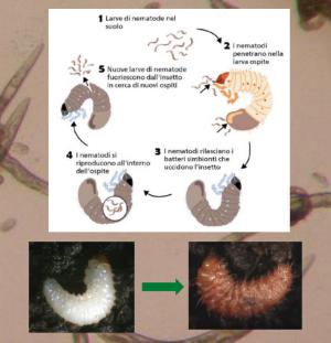 Per affrontare questi insetti, Koppert ha puntato sui nematodi entomopatogeni sviluppando due prodotti: Capirel (che ha come target le larve di nottue e ditteri e le pupe di tripidi) e Sportnem-H (colpisce le larve di coleotteri come le altiche). La strategia di Koppert è stata illustrata dal product development Paolo Banzato. "I nematodi entomopatogeni vanno a svilupparsi a spese degli insetti dannosi: cercano il fitofago, penetrano nella preda attraverso aperture naturali, rilasciano batteri simbionti che si moltiplicano velocemente e portano l'insetto alla morte. Poi i batteri trasformano il contenuto dell'insetto in nutrimento per i nematodi stessi".