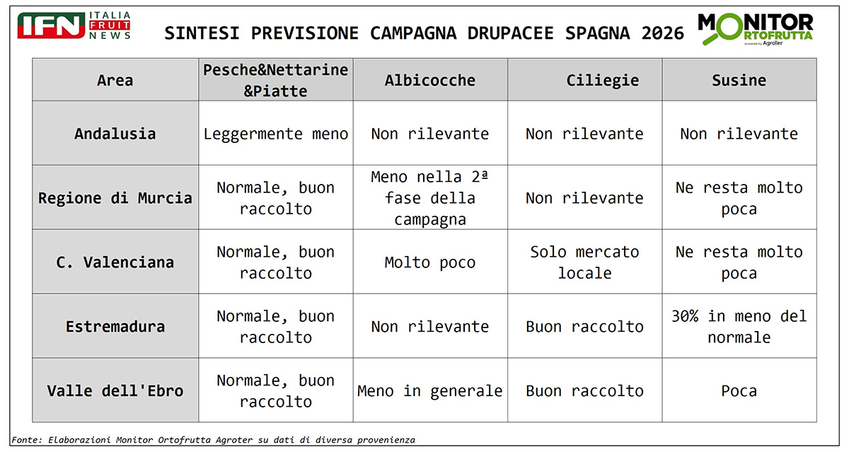 Meno albicocche e meno susine, mentre ciliegie, pesche e nettarine si presentano per ora su binari più regolari. È questo il primo elemento che emerge dall’analisi sulla campagna spagnola delle drupacee, che a metà aprile delinea uno scenario nel complesso abbastanza ordinato, ma con alcune flessioni produttive già visibili, in particolare sulle specie più penalizzate dall’allegagione o dal progressivo ridimensionamento degli impianti.