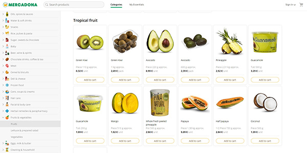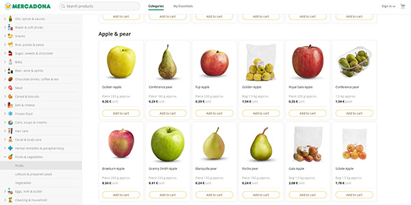 Sul portale ecommerce di Mercadona si può trovare una discreta offerta di prodotti ortofrutticoli. In particolare si contano 41 referenze di frutta, 79 di verdura, 10 di agrumi, 37 di IV Gamma.