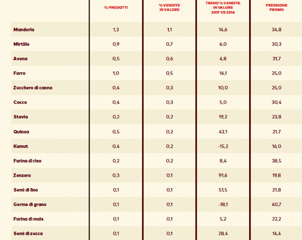 Ma anche avena, farro e quinoa, semi di lino e mirtilli, stevia e farina di riso sono molto gettonati per il loro profilo salutistico e talmente apprezzati dagli italiani da spingere a comprarli anche quando sono usati come ingredienti.