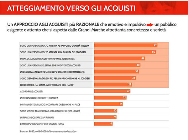 Secondo una recente ricerca di Added Value, nella scelta dei prodotti alimentari il consumatore italiano presta molta attenzione alla qualità, sia delle materie prime sia dei prodotti finiti, al fatto che la produzione sia localizzata in Italia, che i prodotti valorizzino la sua esperienza e siano fedeli alla sua tradizione. Il fatto che gli acquisti siano sempre più spesso decisi in funzione del rapporto qualità-prezzo, e non solo della convenienza promozionale, riporta al centro dell'attenzione il prodotto con il suo contenuto e la sua funzione d'uso.