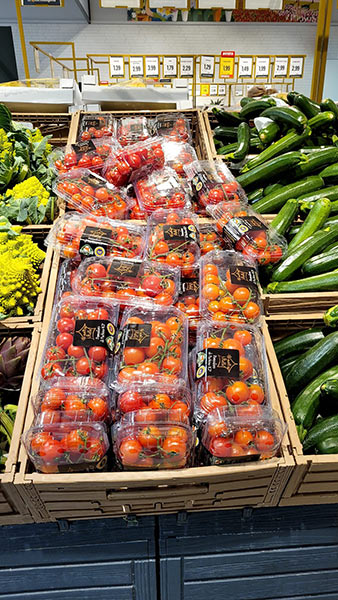 Oltre agli agrumi, all’interno del negozio abbiamo trovato la nocciola di Giffoni IGP, le fragole della Basilicata e il pomodoro di Pachino IGP. Così facendo la catena copre anche le categorie della frutta secca, degli ortaggi e della frutta fresca. Interessante osservare come cambia la strategia sul pricing in base alla referenza: il pomodoro IGP di Pachino, della tipologia datterino nella confezione da 300 grammi, è venduto in promozione a 0,99 euro/pezzo, equivalenti a 3,3 euro/chilo, mentre la fragola della Basilicata nella confezione da 300 grammi è venduta a 2,99 euro/pezzo per un valore al chilo di 9,90 euro. Cosa significa? Un prodotto che ha ancora bassi volumi, come la fragola, viene venduto a prezzo “pieno”, mentre una referenza che genera volumi superiori viene collocata ad un prezzo più competitivo.