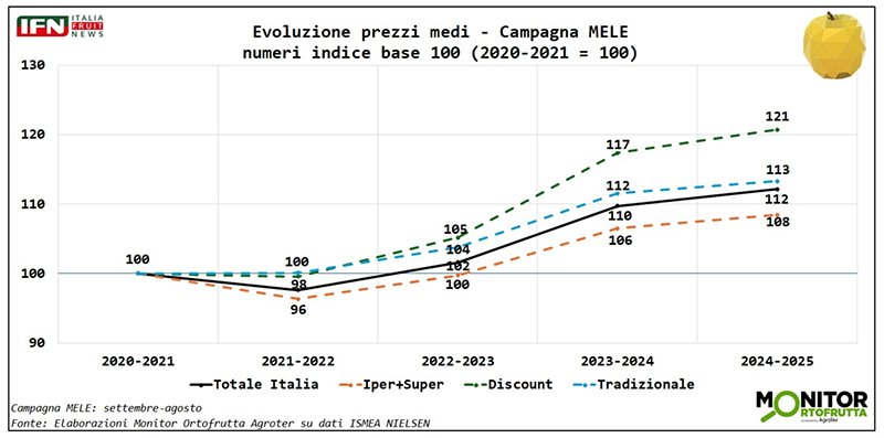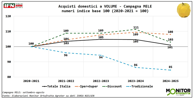 Entrando nel dettaglio dei dati al consumo e osservando le performance dei diversi canali nelle ultime cinque campagne, emerge un quadro chiaro: nell’ultimo biennio la leva prezzo ha seguito una traiettoria inflattiva. Il valore medio nazionale risulta infatti cresciuto di 12 punti nella campagna 2024-25 rispetto alla 2020-21, con un’intensità diversa a seconda dei format distributivi. La spinta è stata più marcata nei discount (+21%), mentre nel canale Iper+Super l’aumento è stato più contenuto (+8%).
