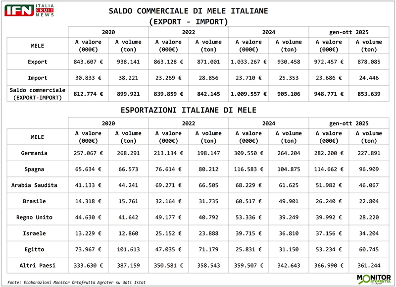 La Germania resta, come da tradizione, un caposaldo con un andamento regolare. Alle spalle si consolida la Spagna, in forte espansione: nel 2024 i valori hanno quasi raddoppiato quelli del 2019 e sono già in linea con il 2025, che con ogni probabilità chiuderà su un nuovo massimo. Al terzo posto si colloca l’Arabia Saudita, mercato che dal 2022 mostra una stabilità interessante. Fuori dall’Europa, spicca il Brasile, passato da 14 milioni nel 2020 a 60 milioni nel 2024, anche se nel 2025 si registra un rallentamento: un segnale che riaccende l’attenzione sul potenziale di un’area che potrebbe beneficiare di nuovi equilibri commerciali, anche alla luce del dossier Mercosur. Tornando nel Vecchio Continente, il Regno Unito si conferma una destinazione solida; Israele ha invece triplicato i volumi in cinque anni e continua a crescere. Chiude il quadro l’Egitto, che fino al 2020 era la seconda piazza per l’export di mele (con poco più di 100 mila tonnellate), poi crollato a 22 mila tonnellate nel 2023: un ridimensionamento che però sembra in fase di recupero, visto che nei primi dieci mesi del 2025 è già tornato attorno a 60 mila tonnellate acquistate.