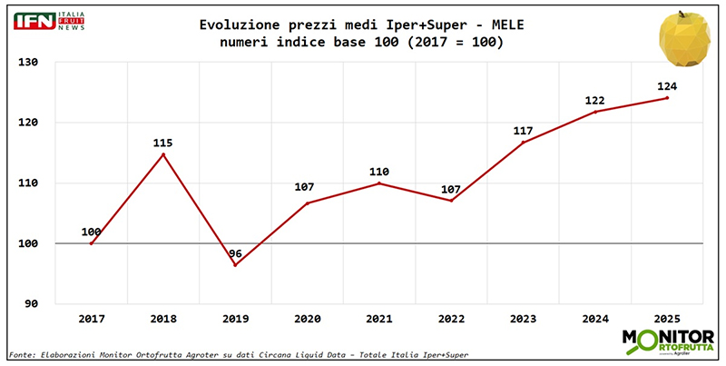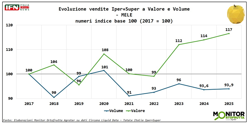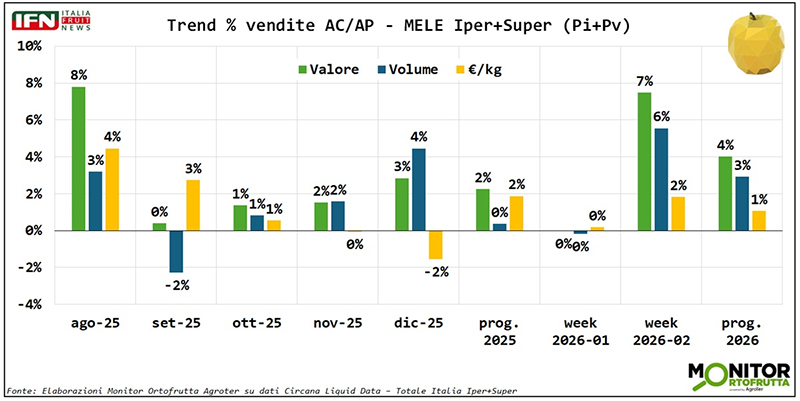 Nel dettaglio, agosto ha evidenziato performance particolarmente interessanti, soprattutto a valore: un segnale che può trovare spiegazione anche nell’effetto “novità”, con alcune mele club che stanno guadagnando spazio in assortimento e intercettano una domanda più premium anche in un periodo meno tradizionale. Nei mesi successivi, la dinamica torna più ordinaria, tra fisiologici alti e bassi: settembre mostra un lieve arretramento dei volumi, mentre dicembre risente di una flessione delle quotazioni.