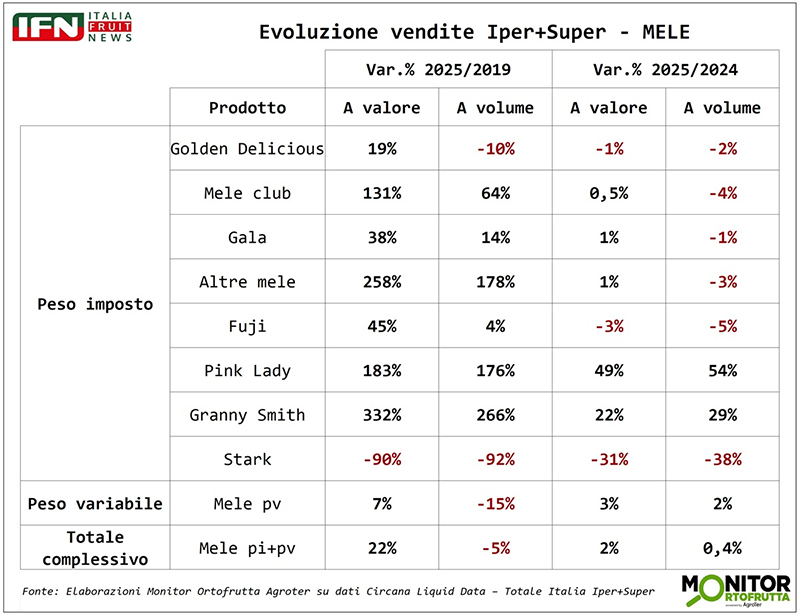 Se invece il confronto si sposta sul più recente 2024-2025, il quadro mostra ulteriori sfumature: Golden e Gala risultano in leggerissimo calo a volume, mentre Fuji e le altre club arretrano qualcosa in più, pur mantenendo una discreta resilienza a valore, soprattutto per le selezioni più nuove. Pink Lady, decana delle club, continua a crescere a doppia cifra, così come una “vecchia gloria” come Granny Smith, che resta l’unica mela verde stabilmente riconoscibile nel reparto. La Red, invece, continua a scendere. Nel complesso, il peso variabile risulta in lieve crescita, a indicare un equilibrio ancora in movimento tra libero servizio e confezionato.