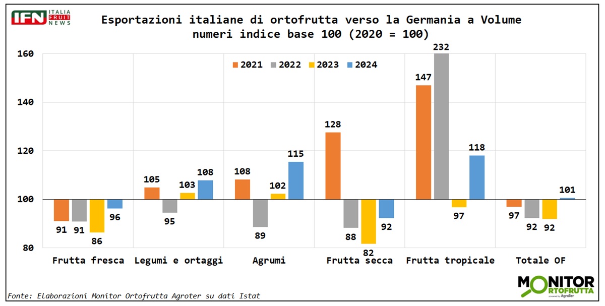 Entrando nel dettaglio della frutta fresca, dopo il forte calo dei volumi registrato nel 2023 (-14% rispetto al 2020), il 2024 segna un ritorno su livelli molto vicini a quelli di inizio periodo, accompagnato però da un deciso incremento a valore (+24%). Il mercato tedesco ha mostrato nel 2024 un forte apprezzamento per le produzioni italiane, con una crescita media dei valori superiore al 20%, a fronte di un aumento dei volumi intorno al 10%, evidenziando un chiaro effetto prezzo. Spicca la frutta tropicale, che registra +58% a valore e +18% a volume, mentre in controtendenza si colloca la frutta secca, in calo del 21% a valore e dell’8% a volume. Nel complesso, le quantità tornano in territorio positivo nel 2024 (+1%) dopo la flessione dell’8% cumulata tra 2022 e 2023, mentre il valore resta stabilmente sopra i livelli del 2020, con una crescita complessiva del 20% nell’ultimo biennio.