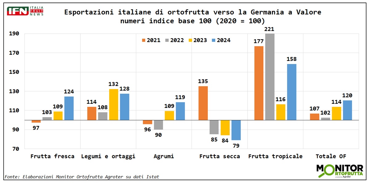 Nelle analisi degli scambi con l’estero dell’ortofrutta italiana, una delle certezze resta la Germania, storicamente primo mercato di destinazione oltreconfine. Un primato che merita di essere approfondito alla luce dei dati del Monitor Ortofrutta di Agroter, utili a comprendere l’evoluzione di un rapporto strategico che, in sintesi, appare ancora solido. Tra il 2020 e il 2024, infatti, le esportazioni verso il mercato tedesco sono cresciute del 20% a valore, raggiungendo 1,8 miliardi di euro, mentre i volumi sono rimasti sostanzialmente stabili (+1%) a quota 1,1 milioni di tonnellate. Nei primi nove mesi del 2025 si registra già un ulteriore incremento del 14% del fatturato e del 9% dei volumi. Se il trend fosse confermato, per la prima volta la Germania potrebbe superare la soglia dei 2 miliardi di euro di acquisti di ortofrutta italiana.