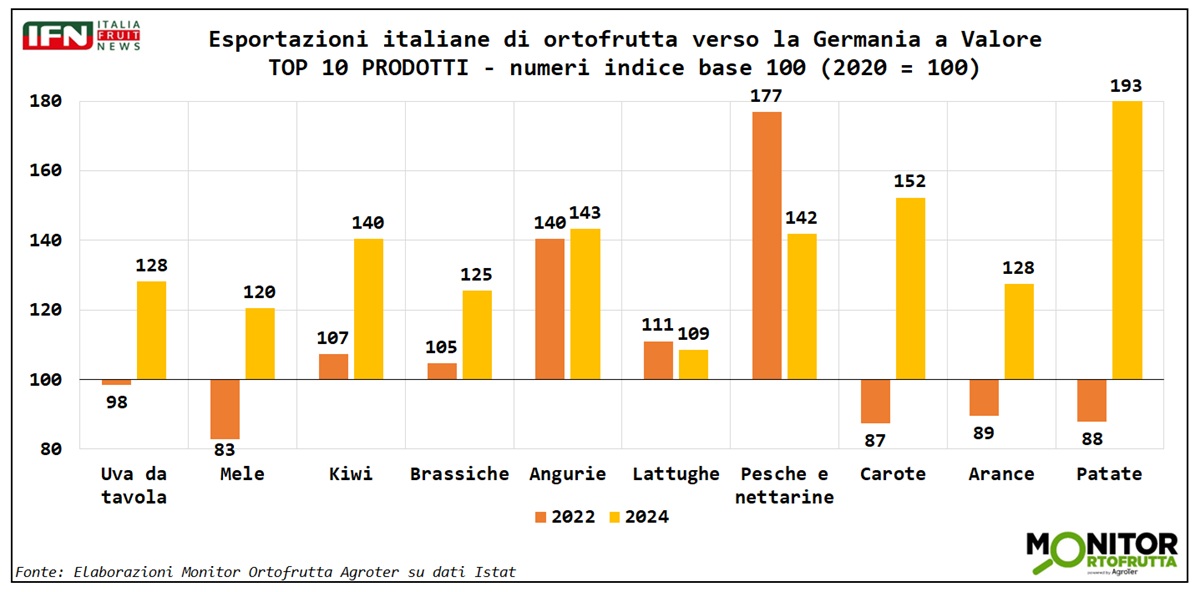 A valore, il quadro è prevalentemente positivo. L’uva da tavola, con un +28% nel 2024, conquista la prima posizione, ma i tassi di crescita più elevati spettano a patate (+93%) e carote (+52%). Superano il 40% anche pomodori, lattughe e soprattutto kiwi, che completano il podio dei prodotti più rilevanti in termini di valore.