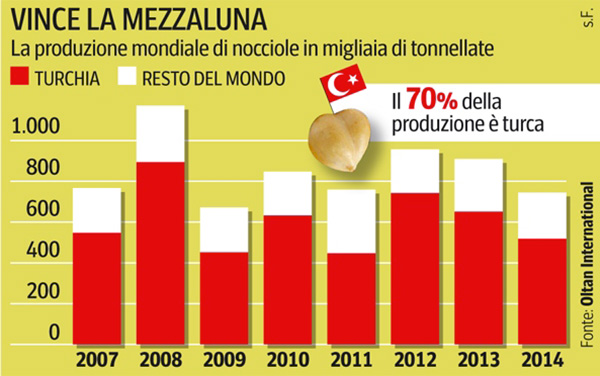 “Mai come quest’anno le nocciole, ingrediente base per le barrette e le creme spalmabili, sono merce rara”, scrive Roberta Scagliarini sul "Corsera". “Il raccolto che si sta chiudendo in Turchia, Paese da cui proviene il 70% della produzione mondiale, e in Italia, secondo produttore, è il più scarso dell’ultimo decennio: i prezzi sono schizzati in su fino al 60%. Ferrero, primo acquirente al mondo di nocciole con un consumo pari al 25% del totale, destinato alla sua Nutella, è l’unico gruppo che non ha problemi di forniture perché Oltan è il produttore numero uno dell’Asia".