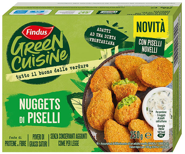 Di merluzzo, di salmone rosa, di pollo…e ora anche di piselli! I nuovi Nuggest di piselli Green Cuisine, che riprendono un’altra forma iconica dell’azienda, sono realizzati con i Piselli Novelli Findus, dolci e teneri, surgelati entro 3 ore dalla raccolta. I nuovi Nuggets vegetali sono fonte di proteine e di fibre, poveri di grassi saturi e possono essere preparati in forno (8 minuti) o in padella (4 minuti).