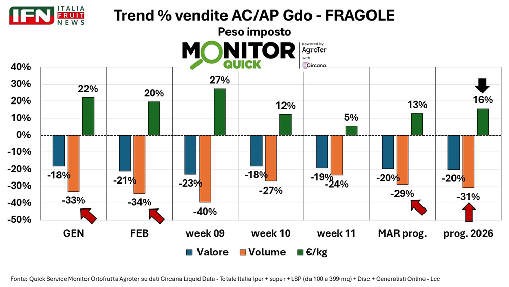 Da Pasqua in avanti, con il miglioramento delle condizioni meteo e in particolare con l’aumento della radiazione solare, che per la fragola è un fattore cruciale, ci aspettiamo una crescita dei volumi che ci fa guardare con fiducia al mese di aprile. Per maggio, invece, sarà necessario valutare con attenzione l’andamento delle temperature, che soprattutto in serra potrebbero avere un impatto significativo.