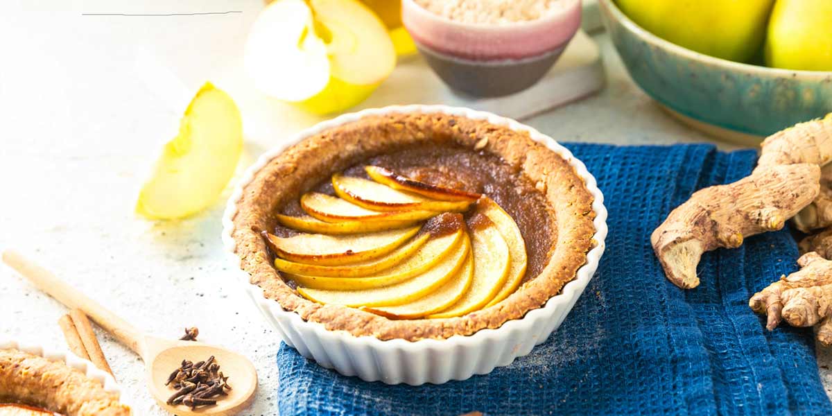 Ingredienti per una teglia da 20 cm di diametro: 100 g di farina nocciole, 80 g di farina di farro, 20 g di olio evo, 2 vaschette di Frullà Classico Mela Cotta, 2 mele Golden, 2 cucchiaini di miele millefiori, 1 cucchiaino di cannella, acqua q.b., noce moscata in polvere q.b., chiodi di garofano in polvere q.b., zenzero in polvere q.b.