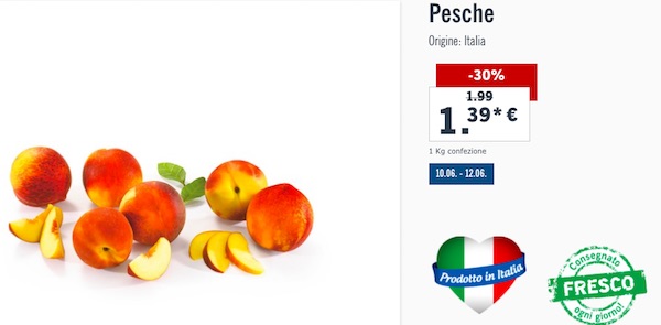 Pesche italiane in offerta anche da Lidl, che però le propone a 1,39 euro il chilo (60 centesimi meno del prezzo pieno), mentre Md nei giorni scorsi vendeva un chilo di pesche gialle (origine non specificata nel volantino) a 1,29 euro. Da Eurospin, invece, solo per le giornate di ieri e di sabato era possibile acquistare un chilo di ciliegie nazionali a 2,99 euro. Sconti importanti sullo stesso prodotto anche in casa DPiù. E anche Leader Price taglia i prezzi della frutta estiva.
