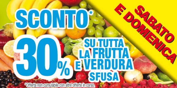 Sconto del 50% da parte della stessa insegna anche per melanzane e cetrioli, sempre italiani (69 centesimi il chilo), insalata di IV gamma sfiziosa e lattughino misticanza Bio in busta (entrambi a 64 centesimi per 200 grammi) nonché per pomodoro datterino siciliano (500 grammi a 1,74 euro) e fagiolini (mezzo chilo a 99 centesimi).