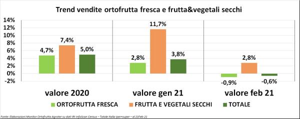 Dalle analisi del Monitor Ortofrutta di Agroter sull’andamento delle vendite nella Gdo, si evince come il reparto “allargato” - comprendente frutta e vegetali freschi e secchi - abbia avuto performance di tutto rispetto nell’anno appena chiuso (+5% nelle vendite a valore, clicca per leggere l’articolo). Tuttavia, l’inizio del 2021 mostra andamenti in peggioramento (+3,8% a valore), con segnali di perdita a febbraio (-0,6%) con l’ortofrutta fresca che perde nello stesso mese lo 0,9% a causa dell’inizio della controcifra rispetto allo scoppio della pandemia.