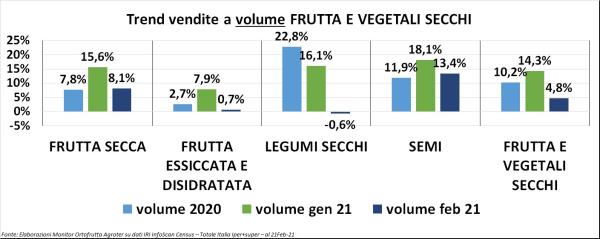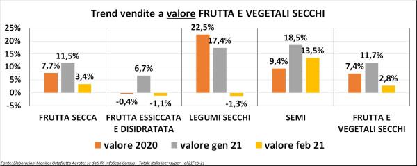 In tutto ciò, frutta e vegetali secchi hanno andamenti sempre migliori rispetto all’ortofrutta fresca, senza mai andare in perdita. Il dato meno positivo è a febbraio con un +2,8% rispetto, però, ad un gennaio in doppia cifra (+11,7%), ancora non influenzato dalla pandemia.