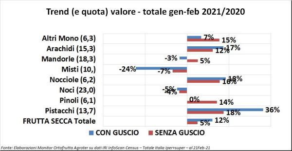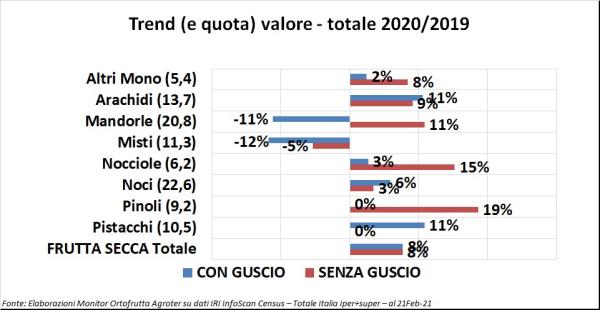 La tendenza sembra ancora più forte nei primi mesi del 2021 (+12% con guscio, +5% senza), d'altronde la situazione non è cambiata molto rispetto ai mesi precedenti.