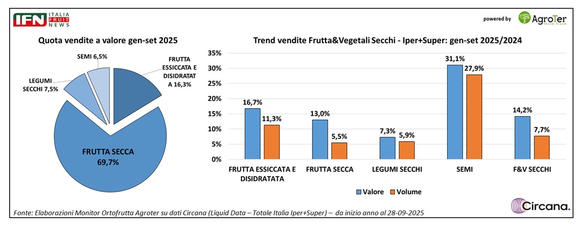 Le vendite della categoria Frutta e Vegetali Secchi continuano a crescere anno dopo anno in Gdo. Anche nei primi nove mesi del 2025, infatti, gli ipermercati e i supermercati italiani registrano andamenti molto positivi.