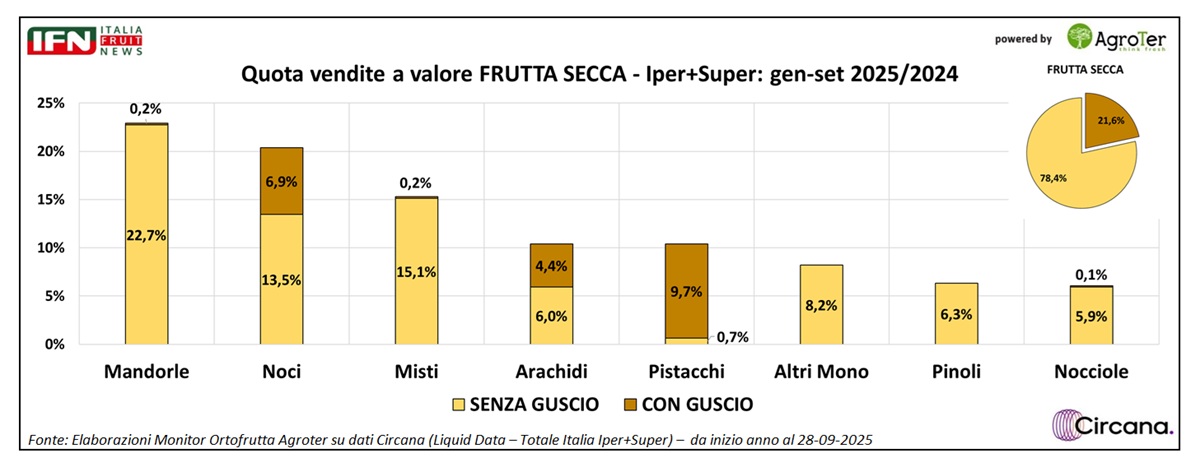 Tra i singoli prodotti, le mandorle guidano le vendite con una quota del 22,9%, seguite dalle noci (20,4%), dove il segmento con guscio rappresenta ancora una quota rilevante del 6,9%, un terzo del totale per le noci. Le referenze di frutta secca mista, che pesano per il 15,3%, sono invece dominate dalle versioni sgusciate, le più apprezzate per la loro praticità e percepite come proposta “convenience” della categoria.
