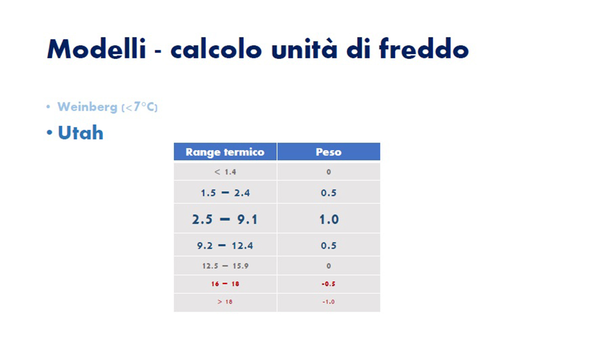 In altri termini, 24 ore fra 2.5 e 9.1 °C corrispondono a 24 Unità di freddo, che diventano la metà se le temperature si posizionano fra 9.2 e 12.4 °C. Addirittura, se si registrassero temperature al di sopra dei 16°C, avremmo una perdita di ore di freddo. È pertanto necessario disporre di tutti gli scostamenti orari di temperatura per evitare significativi errori di stima che potrebbero essere particolarmente rilevanti soprattutto in caso di oscillazioni marcate fra il giorno e la notte come quelle registrate durante il periodo considerato”.
