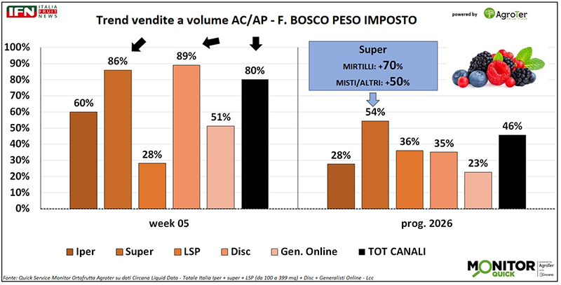 Prosegue anche nella settimana 5 la fase negativa per le vendite di ortofrutta Lcc nella Gdo. Tutti i canali registrano un calo, con l’ipermercato che evidenzia le performance peggiori, mentre il supermercato mostra una maggiore tenuta. L’andamento complessivamente sfavorevole del reparto contrasta però con quello dei frutti di bosco che, dopo un finale di 2025 straordinario, continuano a crescere senza rallentamenti, con picchi di vendita difficilmente rilevati in altre categorie anche in passato.