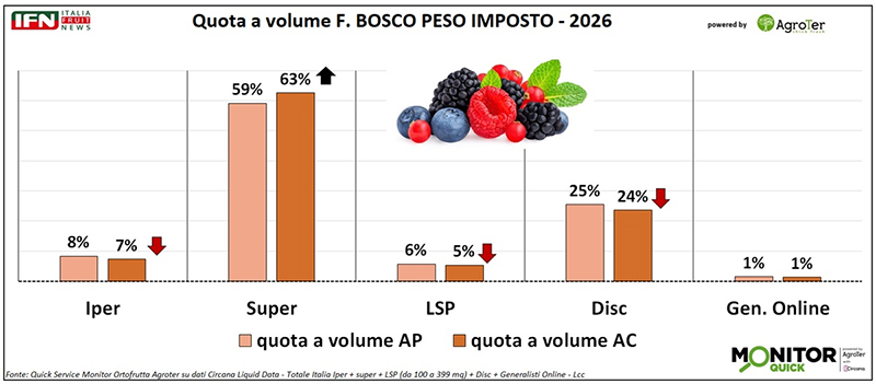 A fare la differenza sono soprattutto i mirtilli, primo prodotto per peso nelle vendite del canale (76%) e ancora protagonisti di una crescita significativa (+70%). Da segnalare anche la buona performance dei mix (+50%), sebbene rappresentino ancora una quota a volume limitata (7%).
