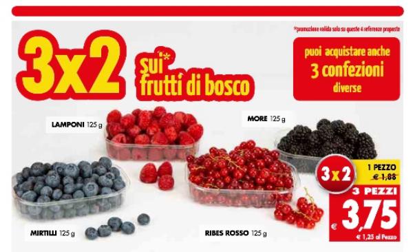 E' una promozione che non si vede spesso in ortofrutta, ma sicuramente è molto vantaggiosa per il cliente: il 3x2. Una formula che nell'ultimo volantino di Tigros - realtà della grande distribuzione che conta una settantina di punti vendita nelle province di Varese, Novara, Verbano Cusio Ossola, Como, Vercelli, Pavia e Milano - è stata scelta per spingere le vendite di frutti di bosco.