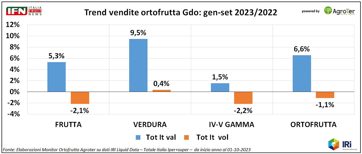 Dopo nove mesi, il reparto ortofrutta degli ipermercati e supermercati della Gdo mostra vendite a volume nel complesso in perdita (-1,1%), con solo le verdure che danno – deboli – segnali di ripresa (+0,4%). La frutta flette del 2,1% a volume e lo fa in modo simile a IV-V Gamma (-2,2%), attestando l’annata difficoltosa per quest’ultima macrocategoria.
