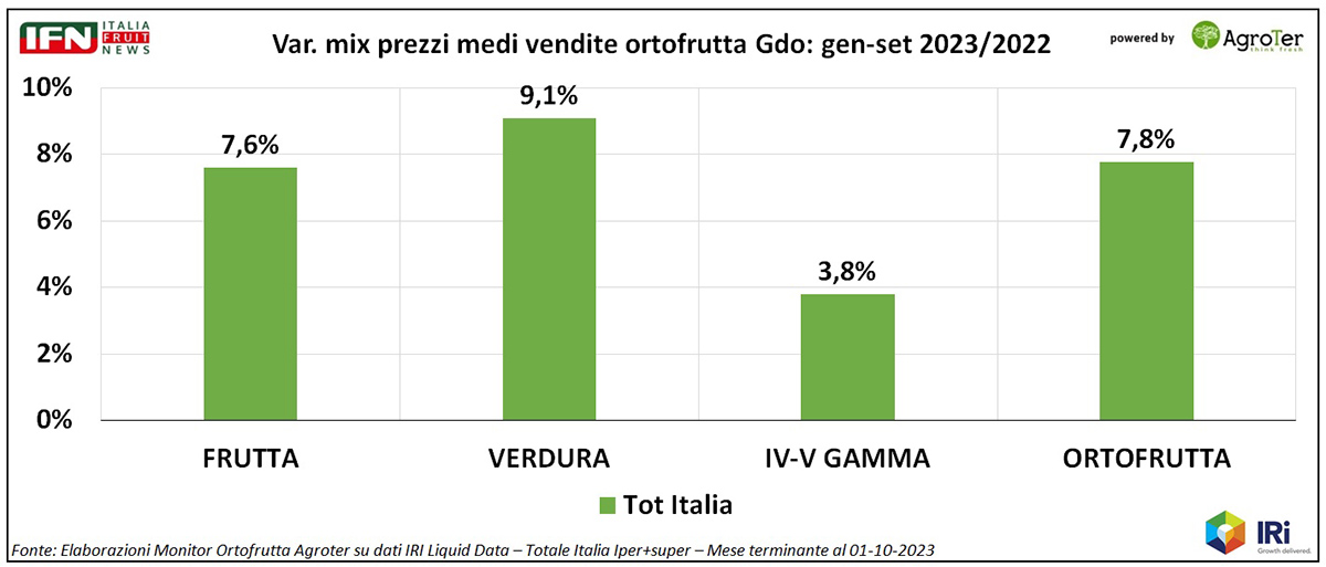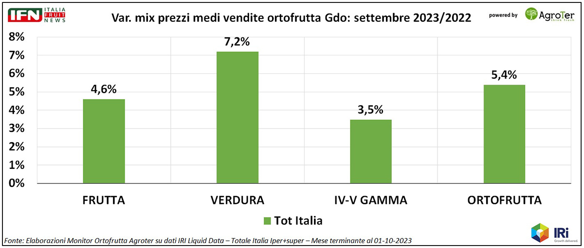 Come si può vedere, da agosto le quantità acquistate si riprendono ed anche l’aumento di prezzi tende a contenersi. Ad incidere sul risultato è stata certamente la ripresa dei consumi per alcuni categorie prettamente estive che, tra agosto e settembre, hanno performato egregiamente (come meloni ed angurie), anche grazie a temperature al di sopra della media.