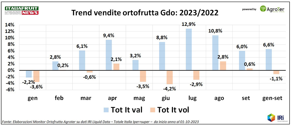 Con settembre si chiude il terzo trimestre ed è tempo di bilanci. Da inizio anno, il reparto ortofrutta della Gdo mostra consumi in riduzione, ma con segnali di ripresa, grazie agli ultimi mesi caldi. Tuttavia, l’inflazione è ancora vicina agli 8 punti. Però a settembre, come ad agosto, le quantità acquistate aumentano, dopo tre mesi di segno meno, e anche l’inflazione sembra mollare un po' la presa.