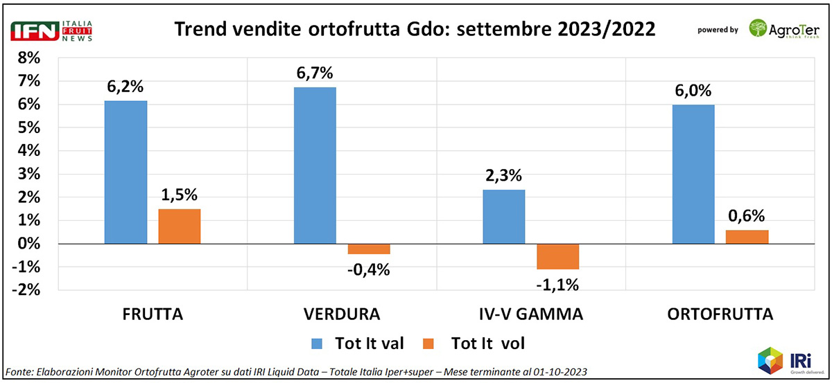 In particolare, settembre è un mese in cui un po' tutti gli indicatori migliorano, e questo anche per la IV-V Gamma che mostra – quantomeno – una flessione più contenuta dei volumi (-1,1% contro un -2,2% da inizio anno). Inoltre, per la frutta si registra un discreto aumento delle quantità (+1,5%), il che fa ben sperare per i mesi avvenire.