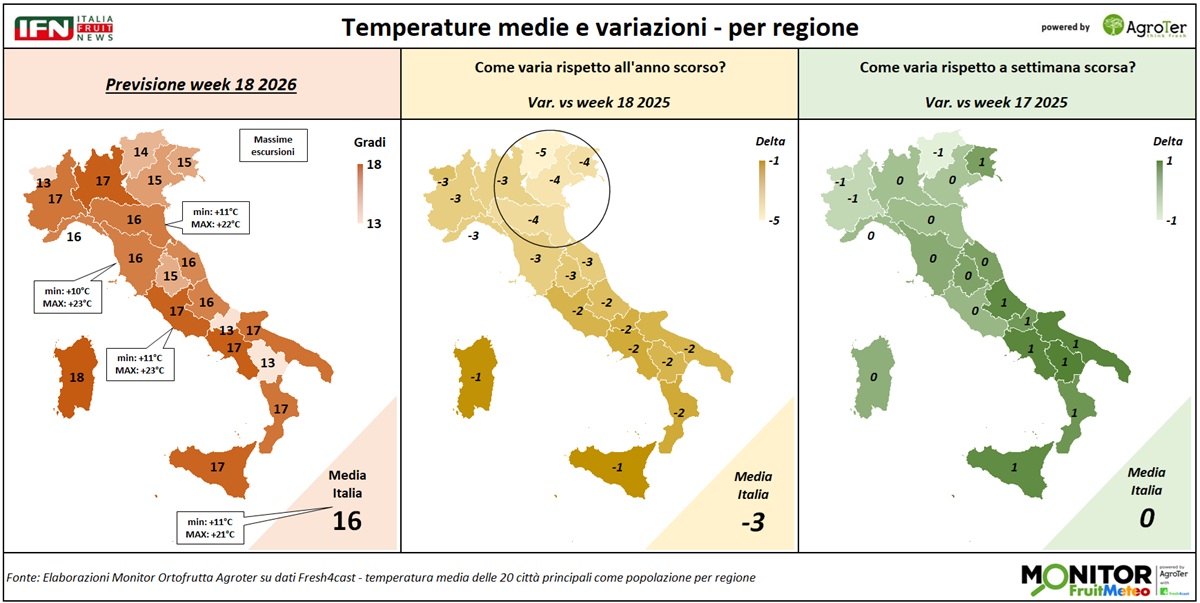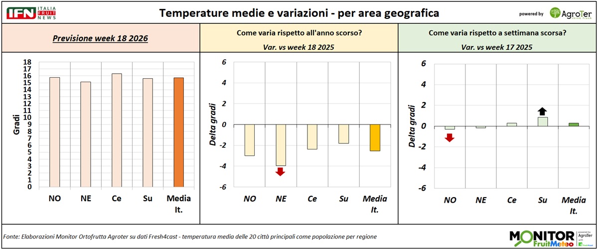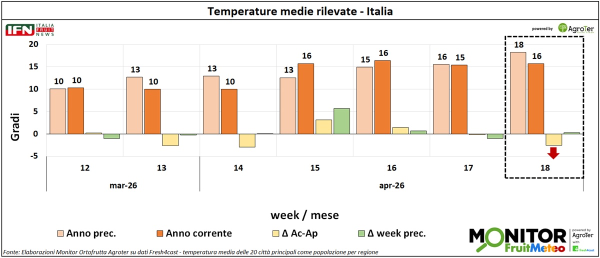 Le analisi del Monitor Ortofrutta si arricchiscono grazie a una nuova collaborazione dedicata a esplorare settimanalmente una variabile spesso decisiva per il settore ortofrutticolo: il meteo. Tra i diversi fattori che influenzano le condizioni climatiche, questa nuova rubrica si concentra in particolare sulle temperature medie registrate lungo la Penisola, con il supporto di Fresh4cast, una piattaforma software in cloud specializzata nella previsione della domanda e nell'ottimizzazione della supply chain per il settore ortofrutticolo.