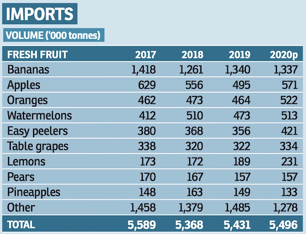Import tedesco di frutta: in ordine di graduatoria banane, mele, arance, angurie, agrumi easy peeler, uva, limoni, pere, ananas