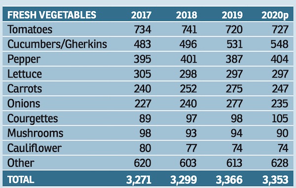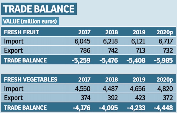 Anche nel 2020 la Germania si è confermata principale importatrice di frutta e verdura fresca d'Europa. Nonostante le critica causate dalla pandemia, i volumi acquisiti sono rimasti analoghi a quelli degli anni precedenti. Secondo le stime preliminari sono stati comprati dall'estero meno ortaggi, principalmente a causa della minore domanda di cipolle e carote. Per entrambe, infatti, l'offerta interna è stata significativamente più alta nella prima metà dell'anno rispetto allo stesso periodo del 2019. I principali fornitori di verdura fresca sono Paesi Bassi, Spagna e Italia mentre solo lo 0,3% circa delle importazioni di verdura proviene dal Regno Unito. La bilancia commerciale delle verdure è fortemente negativa, complice il calo del 16% dell'export rispetto al 2019. Paesi Bassi, Austria e Svezia i principali mercato di riferimento.