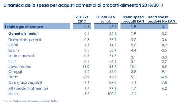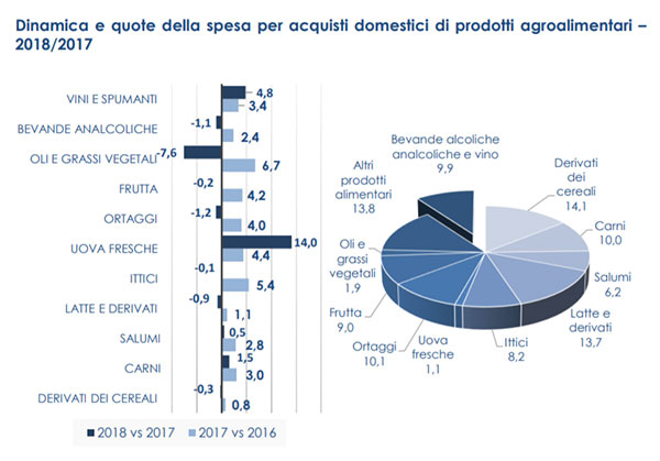 Nel complesso, il 2018 si è chiuso con una spesa alimentare in modesta crescita sul 2017 (+0,3%). Gli ortaggi, rispetto al 2017, segnano una riduzione dell'1,2%, mentre risulta più contenuto il calo della frutta (-0,2%). Si registra, più in generale, uno spostamento delle preferenze verso i prodotti confezionati: +5,1% la frutta e +2,9% la verdura. La spesa dello sfuso, sempre rispetto al 2017, è invece scesa del 9,1% per la frutta e del 4,8% per la verdura.