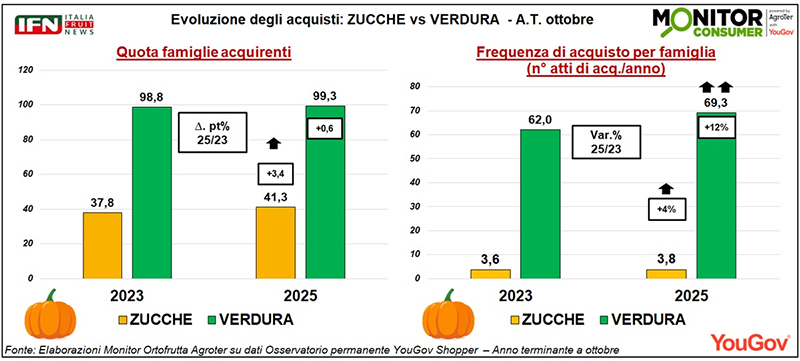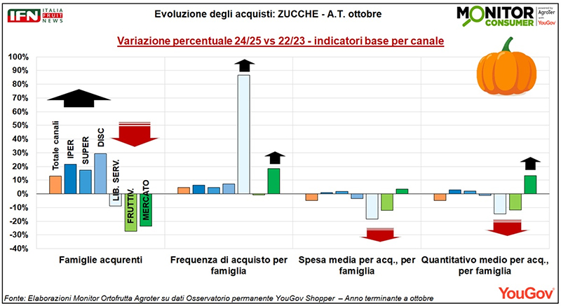 Sul fronte della frequenza di acquisto, invece, sono proprio il libero servizio, in particolare, e il mercato a evidenziare gli incrementi più marcati. In questo caso, la prossimità ai centri urbani gioca un ruolo chiave: per prodotti pesanti come le zucche, la comodità del canale di vicinato continua infatti a fidelizzare una parte della clientela.