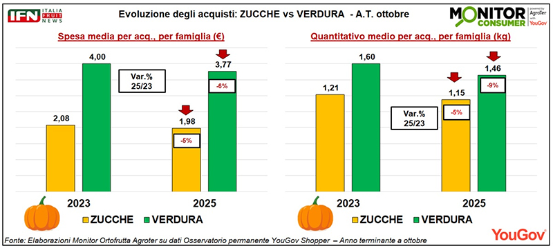 Nonostante l’aumento delle famiglie acquirenti, la spesa e il quantitativo medio di zucche acquistato diminuiscono del 5%, una flessione comunque più contenuta rispetto a quella registrata per la verdura nel complesso (-6% la spesa e -9% i volumi). I valori assoluti restano tuttavia rilevanti: ogni atto di acquisto vale mediamente circa 2 euro per oltre un chilo di prodotto. Questo dato è legato alla modalità di vendita prevalente, ovvero zucche sfuse di prima gamma.
