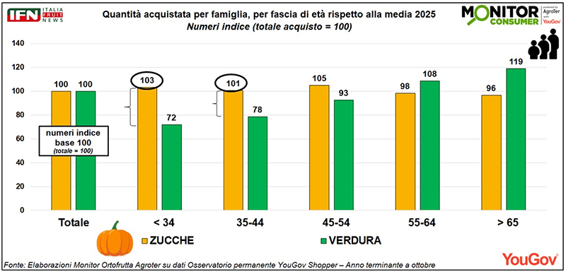 Si tratta inoltre delle fasce di popolazione più attente alle caratteristiche degli alimenti acquistati, soprattutto agli aspetti nutrizionali. In questo contesto, la zucca si distingue come un ortaggio a bassissimo contenuto calorico (clicca qui per approfondire), un elemento ampiamente valorizzato anche dalla comunicazione e dai contenuti diffusi sui social media. (lg)