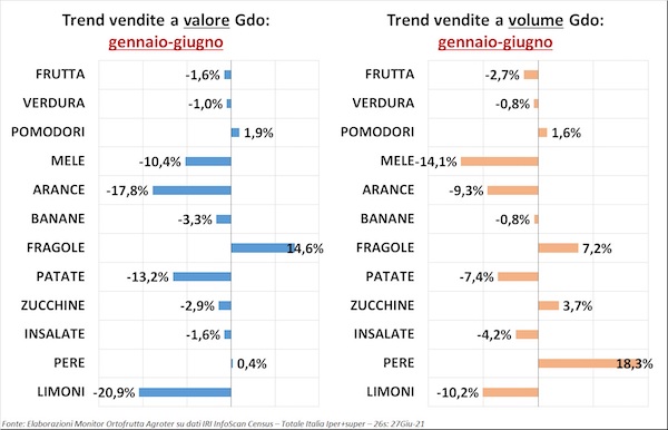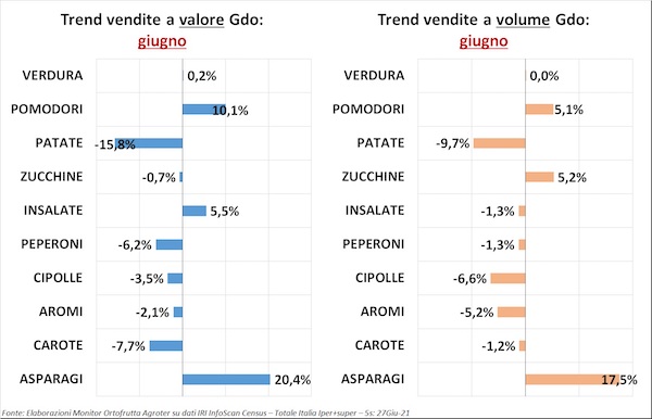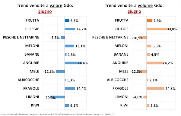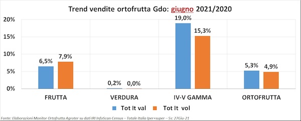 Il titolo dell’ultima uscita del nostro "Ortofrutta in cifre" recitava: “Vendite in Gdo, la riscossa estiva” e in effetti i trend del reparto (+5,3% a valore e +4,9% a volume) parlano chiaro e descrivono una situazione in controtendenza, a giugno, rispetto ai mesi precedenti.