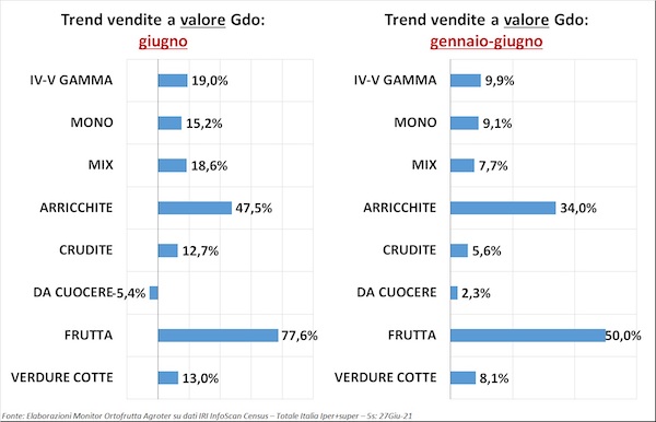 Tra le sottocategorie della IV-V Gamma più in crescita si notano certamente quelle con maggior contenuto di servizio (insalate arricchite e frutta) e che durante i momenti di restrizioni domiciliari della pandemia avevano maggiormente sofferto. Ma del resto tutti gli altri prodotti sono in positivo, a parte le verdure da cuocere che a giugno perdono leggermente terreno.