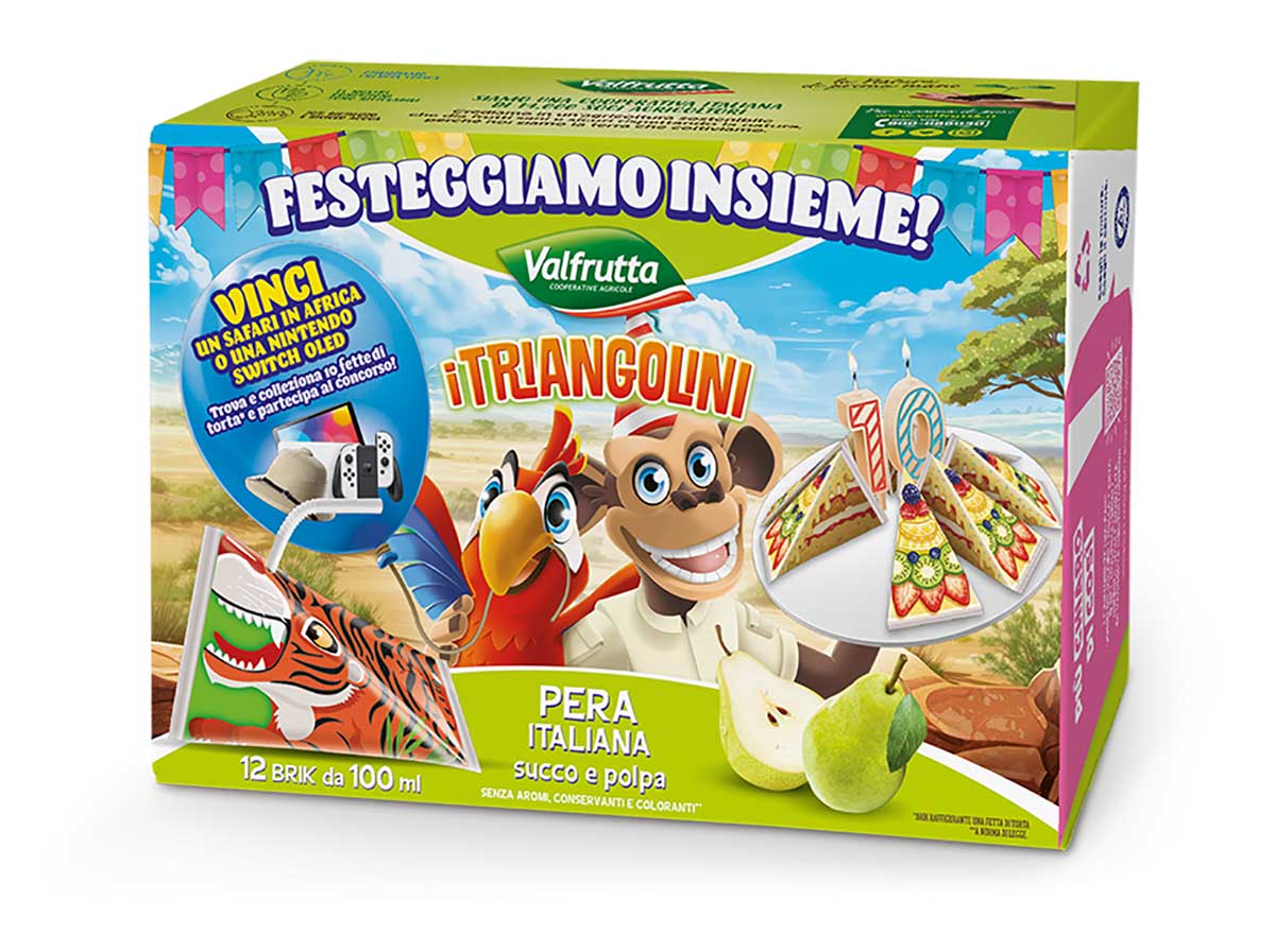 Come ormai da tradizione, non poteva mancare la nuova collezione de I Triangolini Valfrutta per festeggiare questa importante ricorrenza. Protagonista in questo caso è proprio il grande compleanno de I Triangolini, celebrato anche con un nuovo concorso: in ogni confezione, oltre ai consueti simpatici personaggi degli animali, saranno presenti fino a tre brik che presenteranno sulla confezione il disegno di una porzione di torta. Mettendo insieme 10 Triangolini con i disegni delle porzioni di torta, sarà possibile costruire la Triangotorta. A quel punto basterà farsi un selfie insieme alla “torta” da inserire poi nell’apposito sito per partecipare al concorso (clicca qui per approfondire) e provare così a vincere una Nintento Switched Oled o un viaggio safari in Africa, che saranno assegnati con un’estrazione finale.
