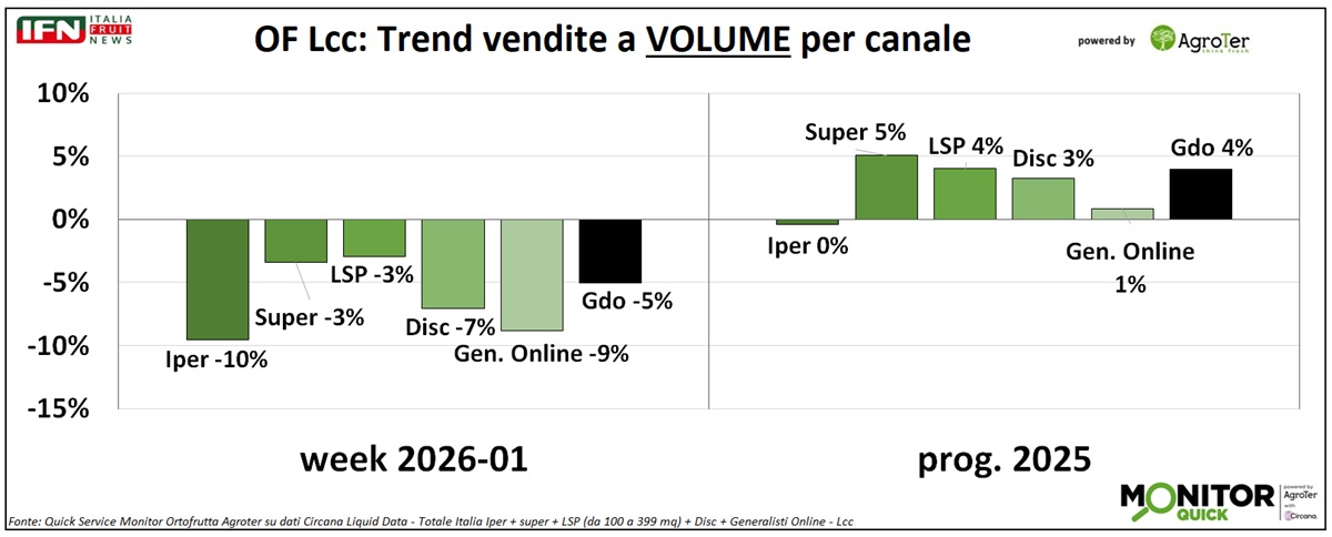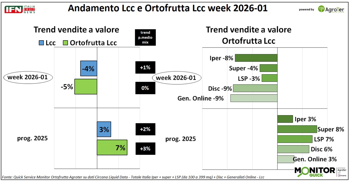 Rispetto a una crescita a valore del 3% e del 7% rispettivamente per Largo Consumo Confezionato e l’ortofrutta Lcc sull’intero 2025, la prima settimana del 2026 si apre in rallentamento. Con prezzi medi mix stabili o in lieve aumento, le vendite registrano una flessione del 4% per l'Lcc e del 5% per l’ortofrutta a peso imposto. Per quest’ultima, il calo a volume (-5%) risulta più contenuto in supermercati e libero servizio (-3%), mentre appare più marcato negli ipermercati (-10%) e nei discount (-7%).