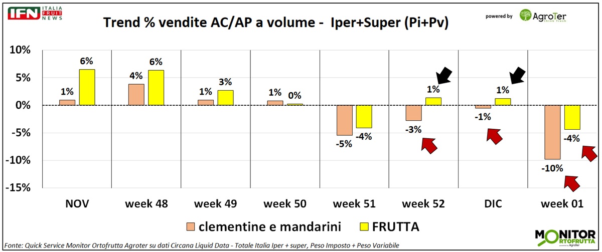 Nei mesi invernali le categorie agrumicole occupano stabilmente le prime posizioni nel ranking delle vendite, ma sono anche le più esposte a squilibri legati alla disponibilità di prodotto o a rallentamenti della domanda, con effetti sulla controcifra anno su anno. È quanto accaduto a clementine e mandarini, caratterizzati da una campagna poco esaltante: dopo una lieve crescita dei volumi in ipermercati e supermercati tra novembre (+1%) e l’inizio di dicembre (week 48 +4%, week 49 e 50 +1%), da metà mese il trend ha invertito la rotta (week 51 -5%, week 52 -3%), portando l’intero mese di dicembre in lieve flessione (-1%), e registrando un peggioramento nella prima settimana dell’anno (-10%).