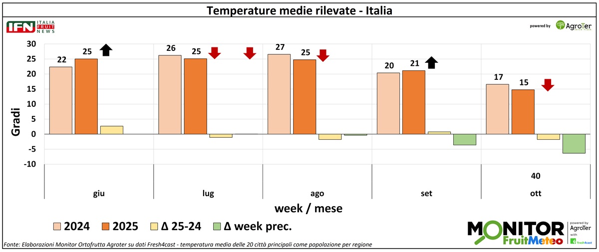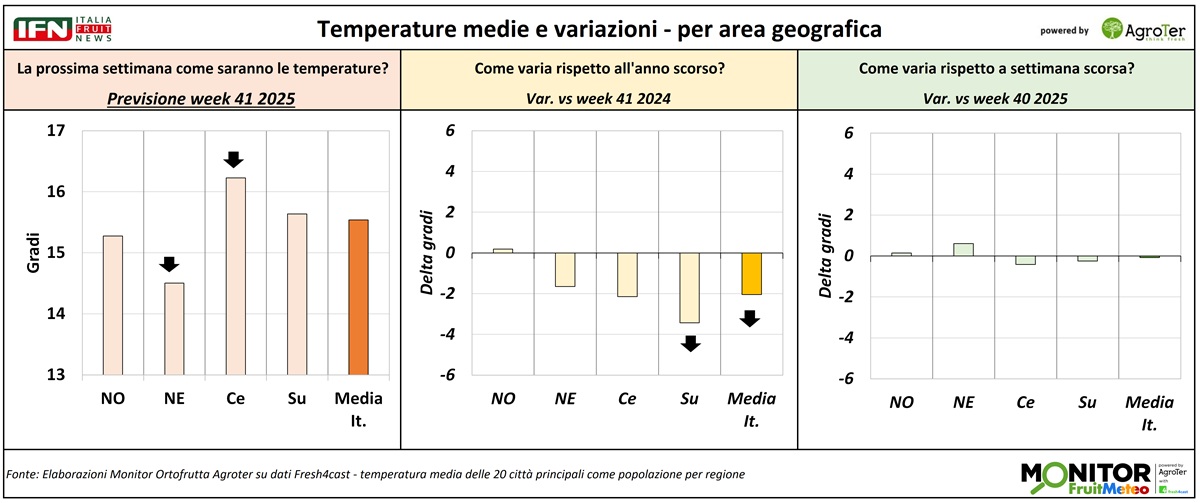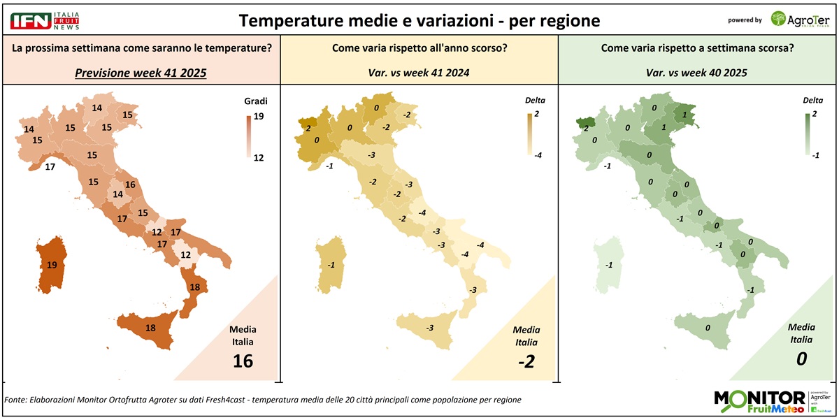 Le analisi del Monitor Ortofrutta si arricchiscono grazie a una nuova collaborazione dedicata a esplorare settimanalmente una variabile spesso decisiva per il settore ortofrutticolo: il meteo. Tra i diversi fattori che influenzano le condizioni climatiche, questa nuova rubrica si concentra in particolare sulle temperature medie registrate lungo la Penisola, con il supporto di Fresh4cast, una piattaforma software in cloud specializzata nella previsione della domanda e nell'ottimizzazione della supply chain per il settore ortofrutticolo.