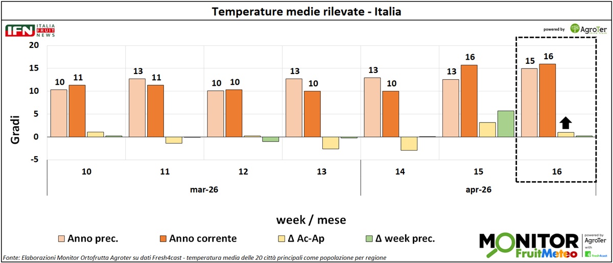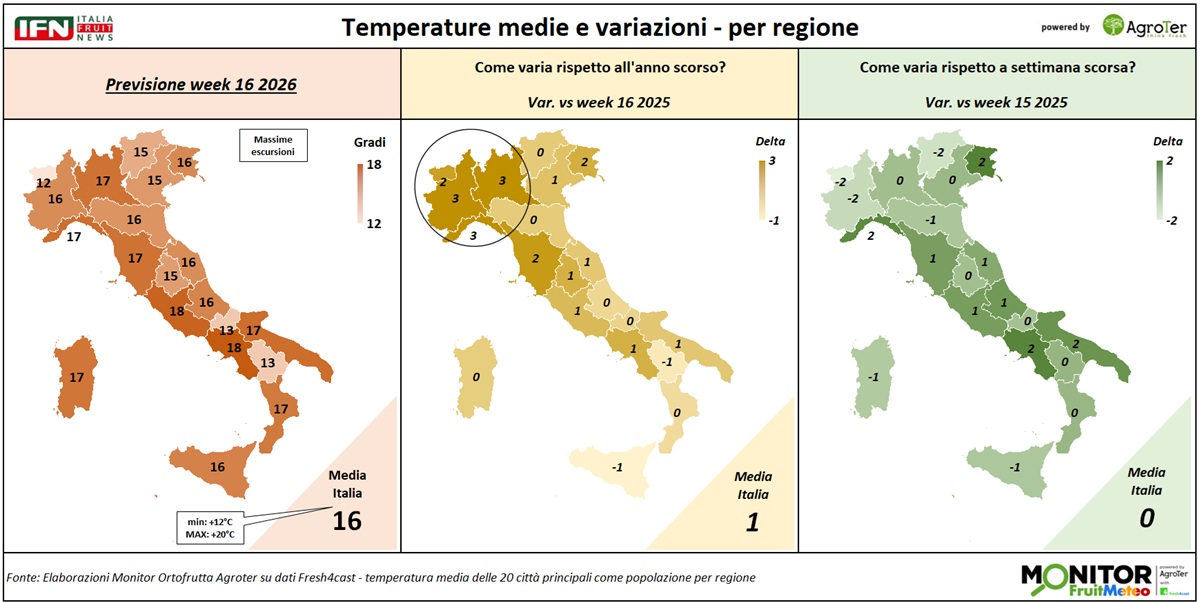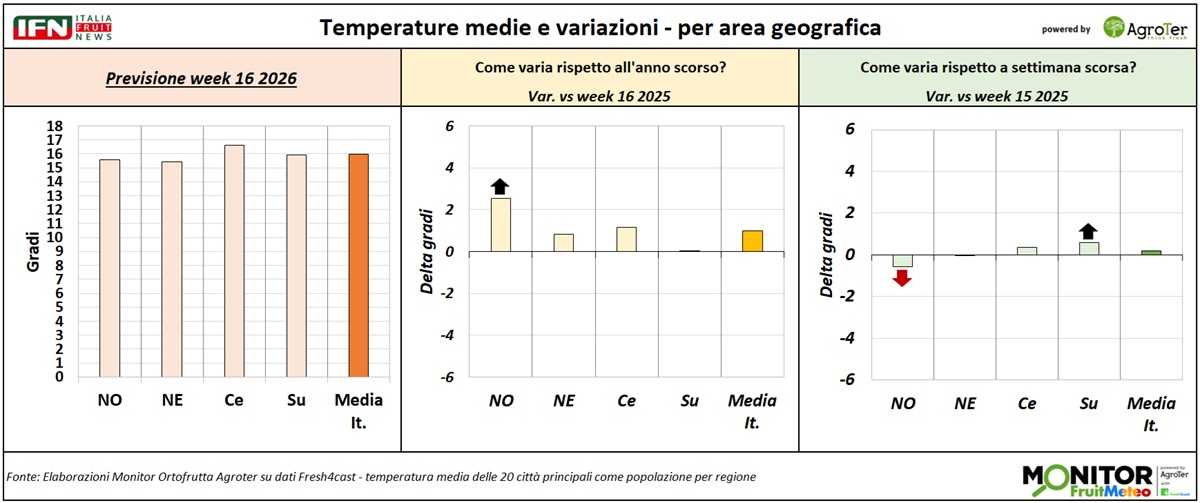 Le analisi del Monitor Ortofrutta si arricchiscono grazie a una nuova collaborazione dedicata a esplorare settimanalmente una variabile spesso decisiva per il settore ortofrutticolo: il meteo. Tra i diversi fattori che influenzano le condizioni climatiche, questa nuova rubrica si concentra in particolare sulle temperature medie registrate lungo la Penisola, con il supporto di Fresh4cast, una piattaforma software in cloud specializzata nella previsione della domanda e nell'ottimizzazione della supply chain per il settore ortofrutticolo.