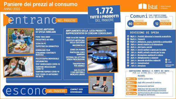 Nel paniere del 2022 utilizzato per il calcolo degli indici NIC (per l’intera collettività nazionale) e FOI (per le famiglie di operai e impiegati) figurano 1.772 prodotti elementari (1.731 nel 2021), raggruppati in 1.031 prodotti, a loro volta raccolti in 422 aggregati.
