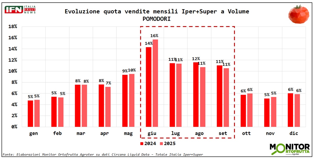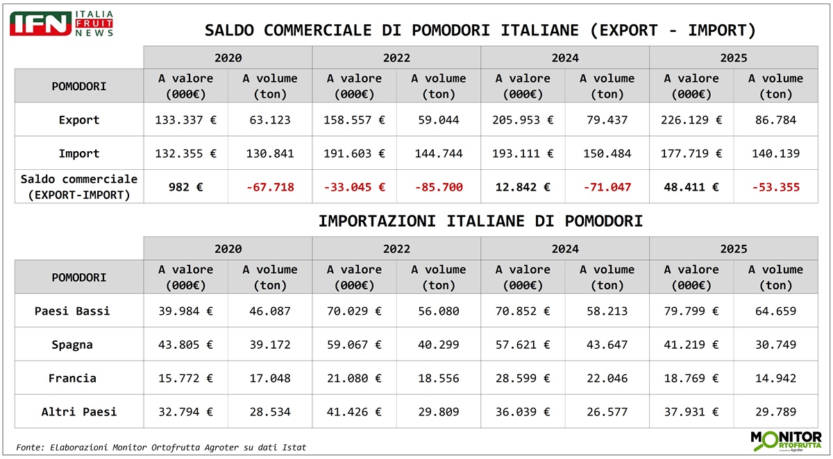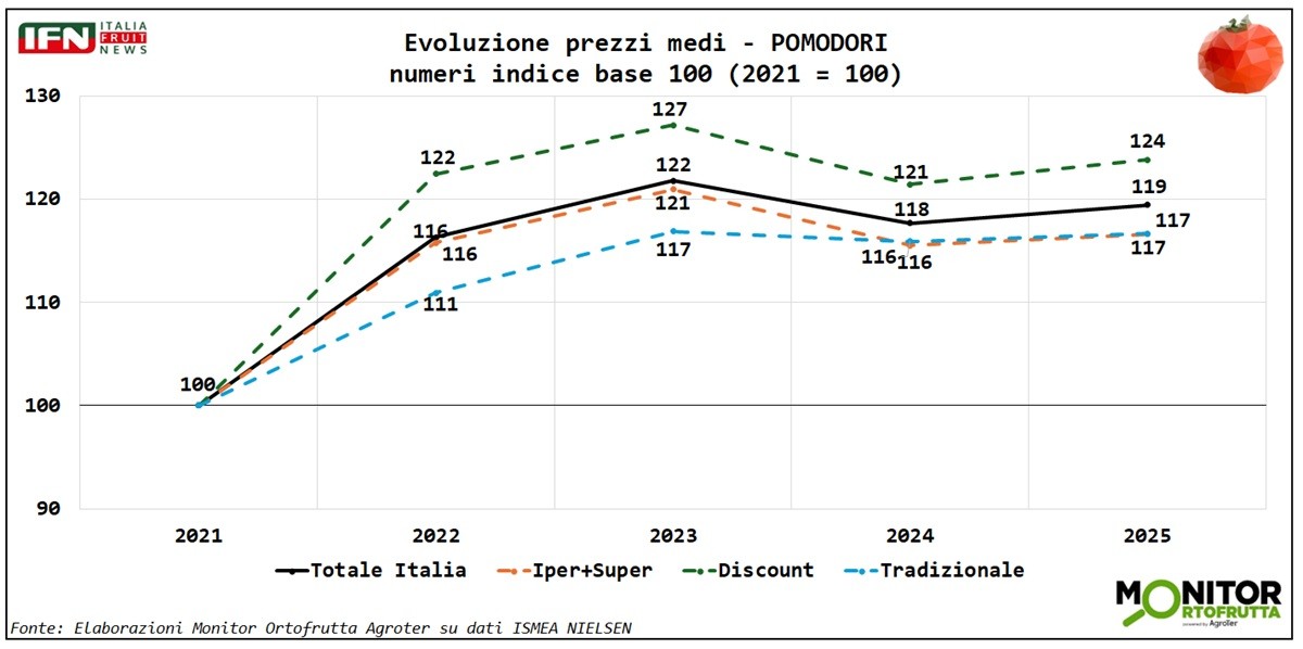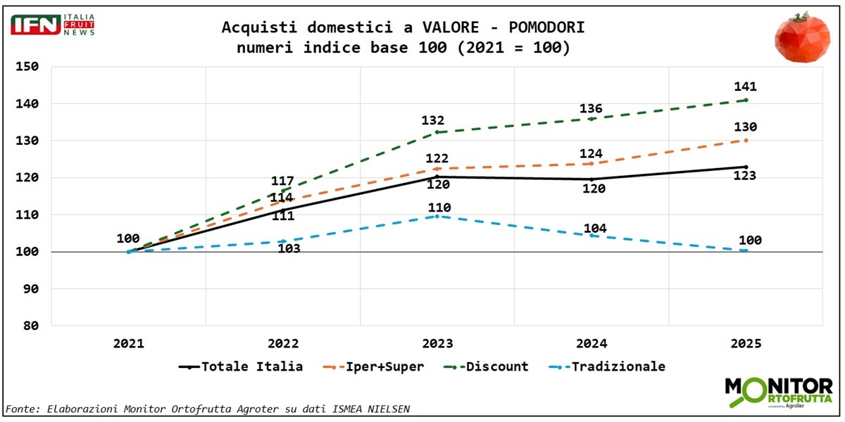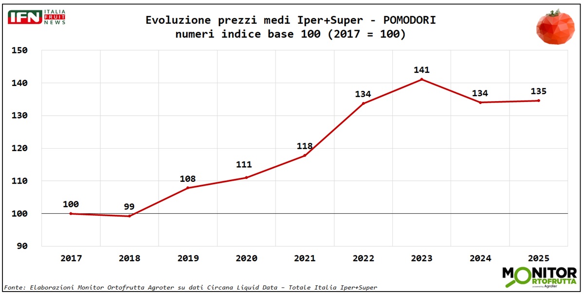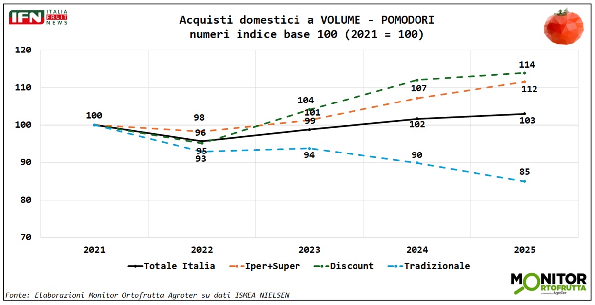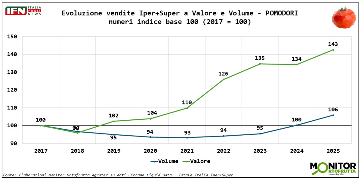 Nel giro di cinque anni il pomodoro italiano ha guadagnato quasi 100 milioni di euro di export, superato i 220 milioni di vendite oltreconfine e riportato la bilancia commerciale in attivo per circa 50 milioni. Ma il dato forse più interessante è un altro: dopo il picco inflattivo del 2022-2023, la categoria non solo ha tenuto, ma nel 2025 è tornata a crescere anche nei volumi, con una progressione sostenuta dalla Gdo e un fatturato che nell’iper+super, su base decennale, segna un balzo del 43%. Segnali che raccontano una categoria in salute, capace di difendere il valore, spingere sull’assortimento e consolidare il proprio peso strategico all’interno del reparto ortofrutta.