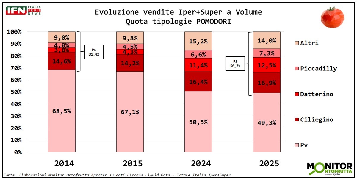 La prima tendenza è la progressione costante del peso imposto, cioè del confezionato, che ha sottratto circa 20 punti di quota al peso variabile: quest’ultimo è sceso da quasi il 70% a poco meno del 50%. Parallelamente, sono cresciute le tipologie a bacca piccola e, in particolare, il datterino, che ha quadruplicato la propria incidenza all’interno del confezionato. Una progressione che non mostra segnali di rallentamento, visto che la crescita prosegue anche nel passaggio dal 2024 al 2025.